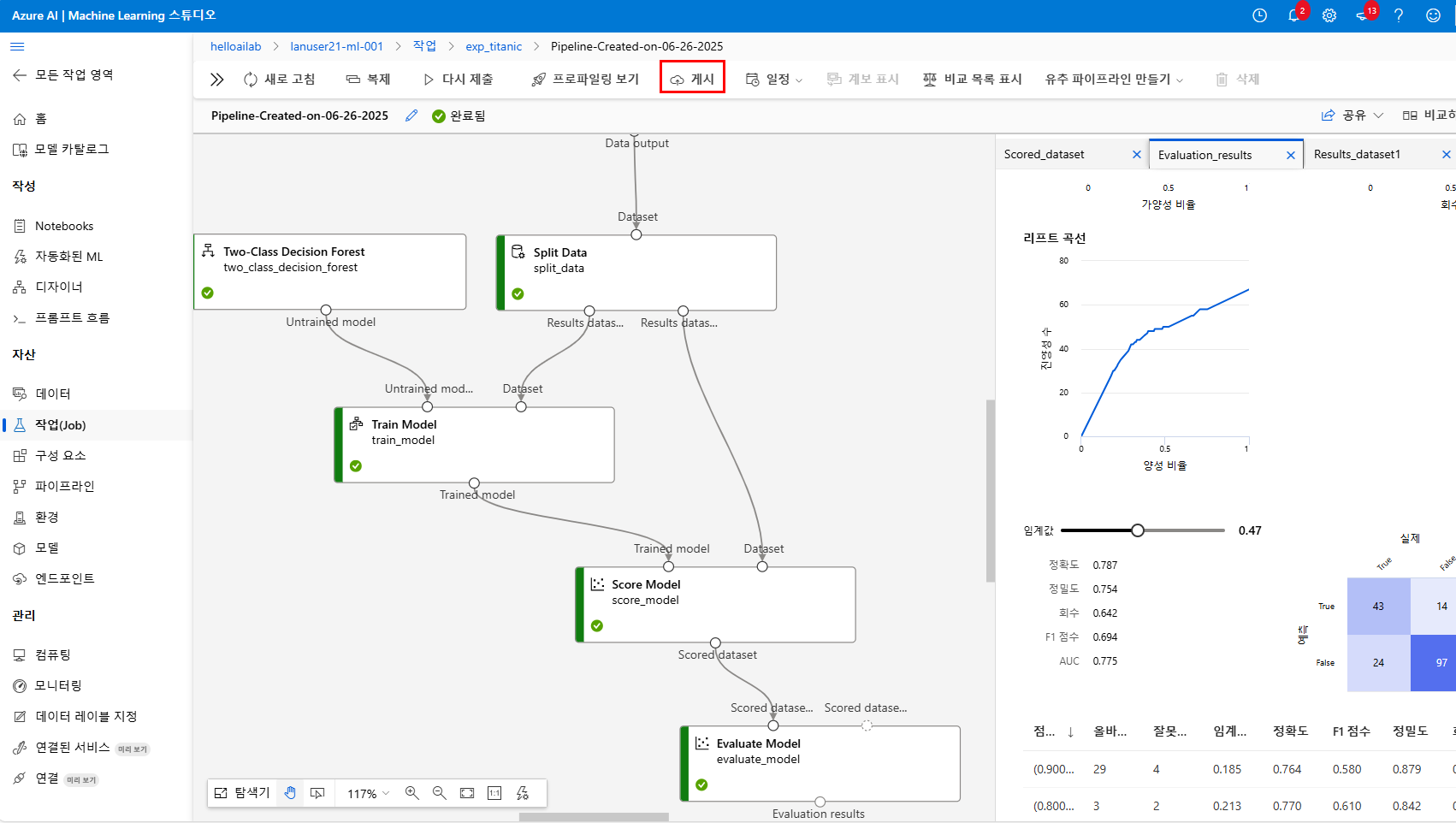 모델 학습과 평가가 완료된 후, 해당 파이프라인을 배포 가능한 형태로 게시할 수 있는데요